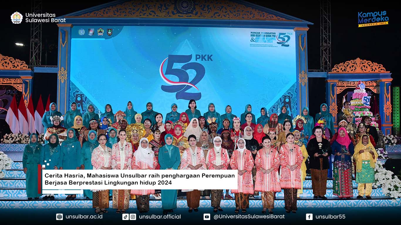 Mahasiswa Universitas Sulawesi Barat (Unsulbar) Program Studi Akuakultur Fakultas Peternakan dan Perikanan Hasria, berhasil meraih prestasi dan mendapatkan Piagam Penghargaan sebagai perempuan berjasa dan berprestasi bidang lingkungan hidup 2024