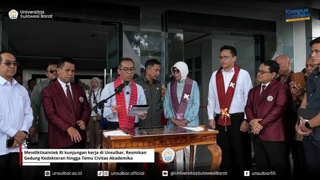 Bersama rektor Unsulbar, Prof.Dr. Muhammad Abdy, S.Si., M.Si, Mendiktisaintek dan rombongan disambut didepan gedung Kedokteran dilanjutkan dengan penandatanganan prasasti secara simbolik