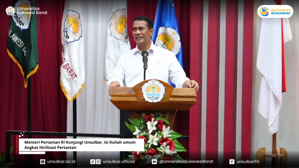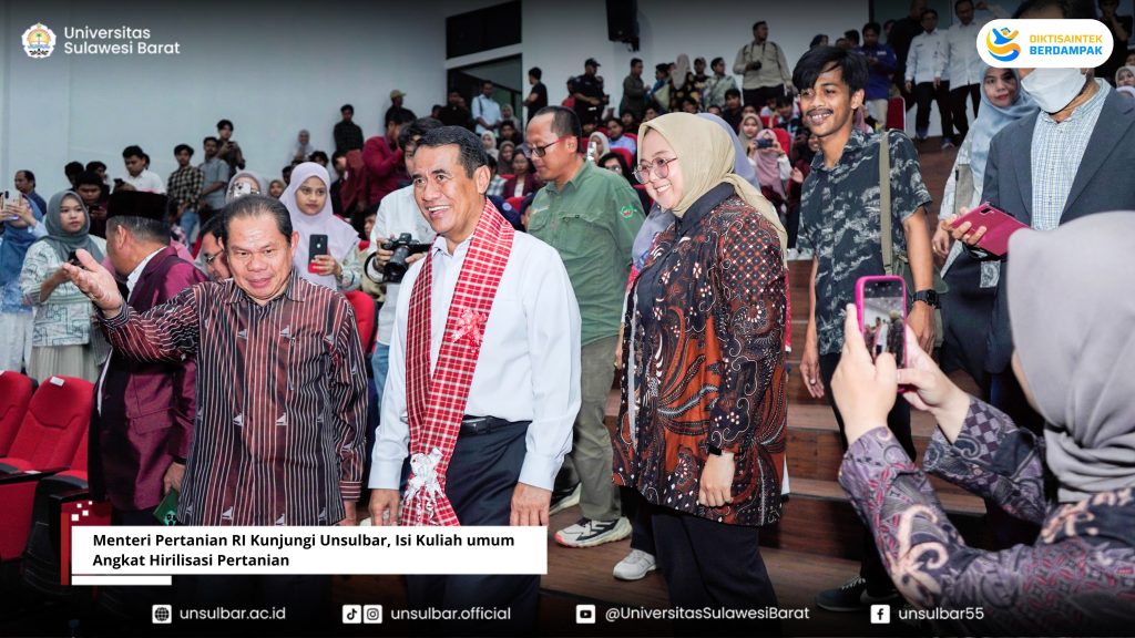 Perdana kunjungan, Menteri Pertanian Republik Indonesia, Dr. Ir. H. Andi Amran Sulaiman, M.P, ke Unsulbar bawakan kuliah umum bertajuk Studium Generale yang diselenggarakan Fakultas Pertanian dan Kehutanan (Fapertahut) dengan tema “Inovasi dan Teknologi dalam Meningkatkan Produktivitas dan Kesejahteraan Petani”.