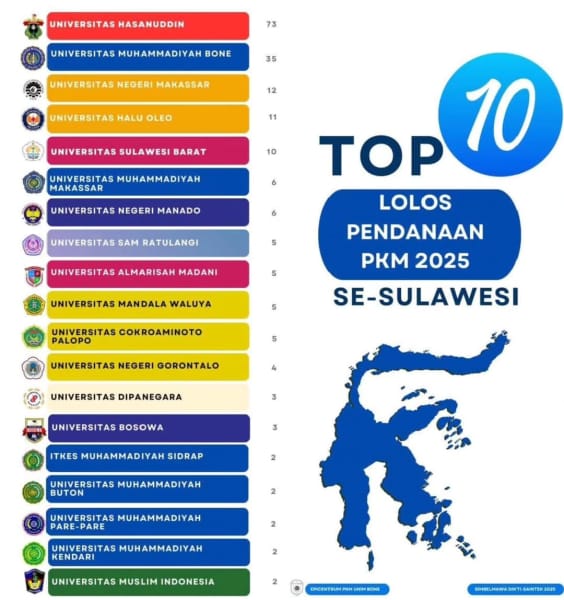 10 besar perguruan tinggi se-Sulawesi yang lolos PKM 2025, posisi pertama ditempati Universitas Hasanuddin (Unhas) dengan 73 proposal, disusul Universitas Muhammadiyah Bone (35 proposal), Universitas Negeri Makassar (12 proposal), dan Universitas Halu Oleo (11 proposal).