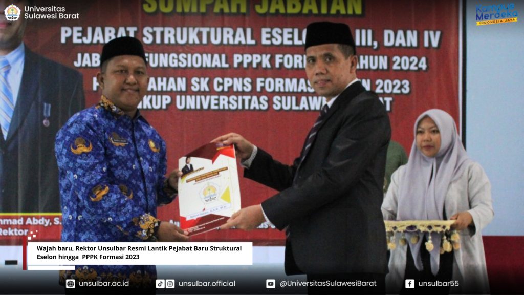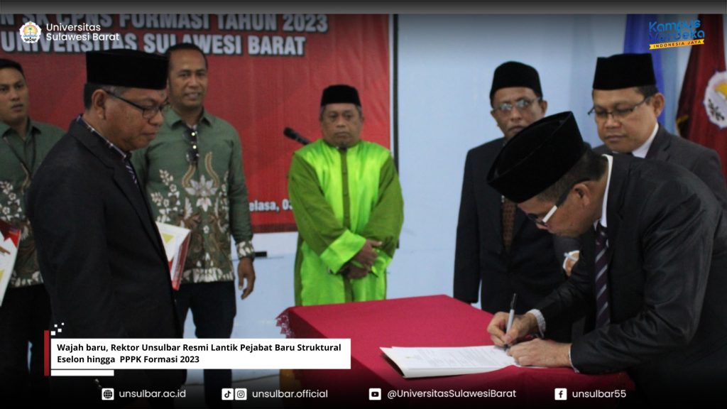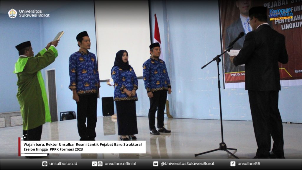 Universitas Sulawesi Barat- Rektor Unsulbar Prof. Dr. Muhammad Abdy S.Si., M.Si resmi lantik segenap pejabat struktural eselon II,III hingga eselon IV serta pengambilan sumpah jabatan fungsional PPPK formasi 2023 Unsulbar